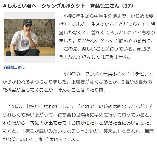 【悲報】ジャングルポケット斉藤、学生時代イジメられていたことを告白
