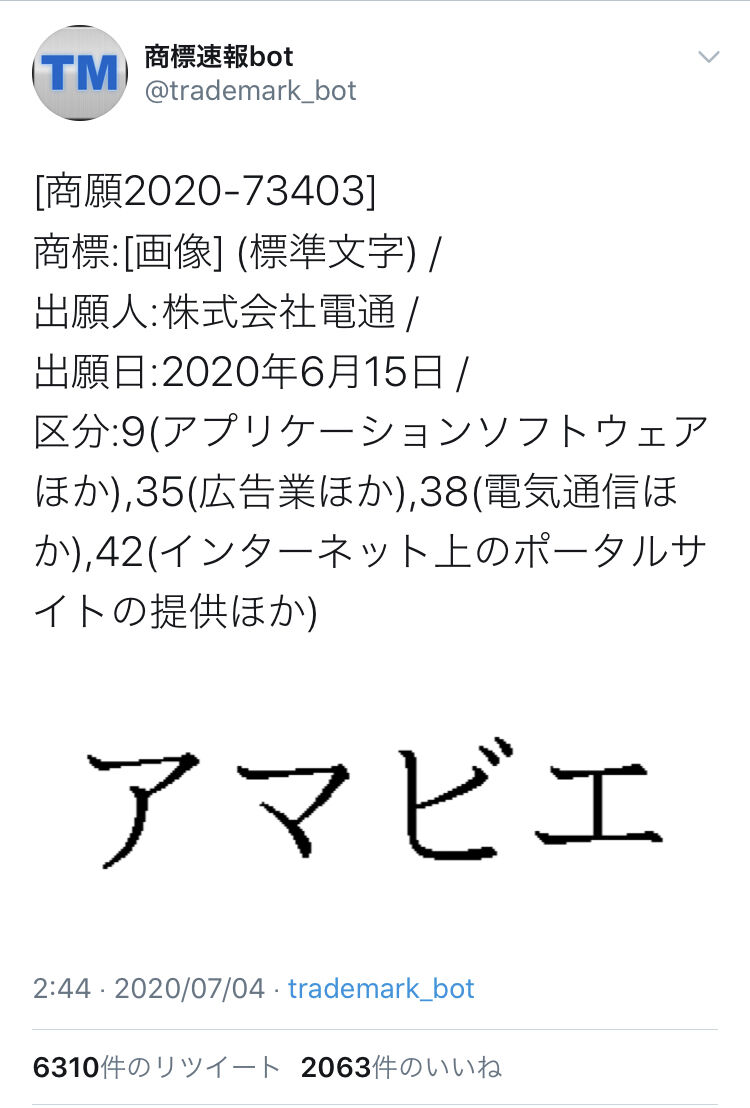 株式会社電通は6日、「アマビエ」の商標登録出願を取り下げた。同社への取材で分かった。ネット上などで「権利を独占するつもりか」等の批判が寄せられていたことを考慮したもので、同社は「独占的かつ排他的な使用は全く想定しておりませんでした」と釈明している。
