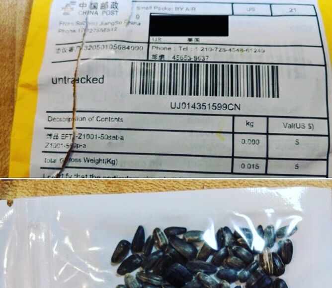 不審な郵便物のラベルには中国語の表記があり、中身についてはほとんどの場合、宝飾品と記載されているが、実際には正体不明の種子が入っている。