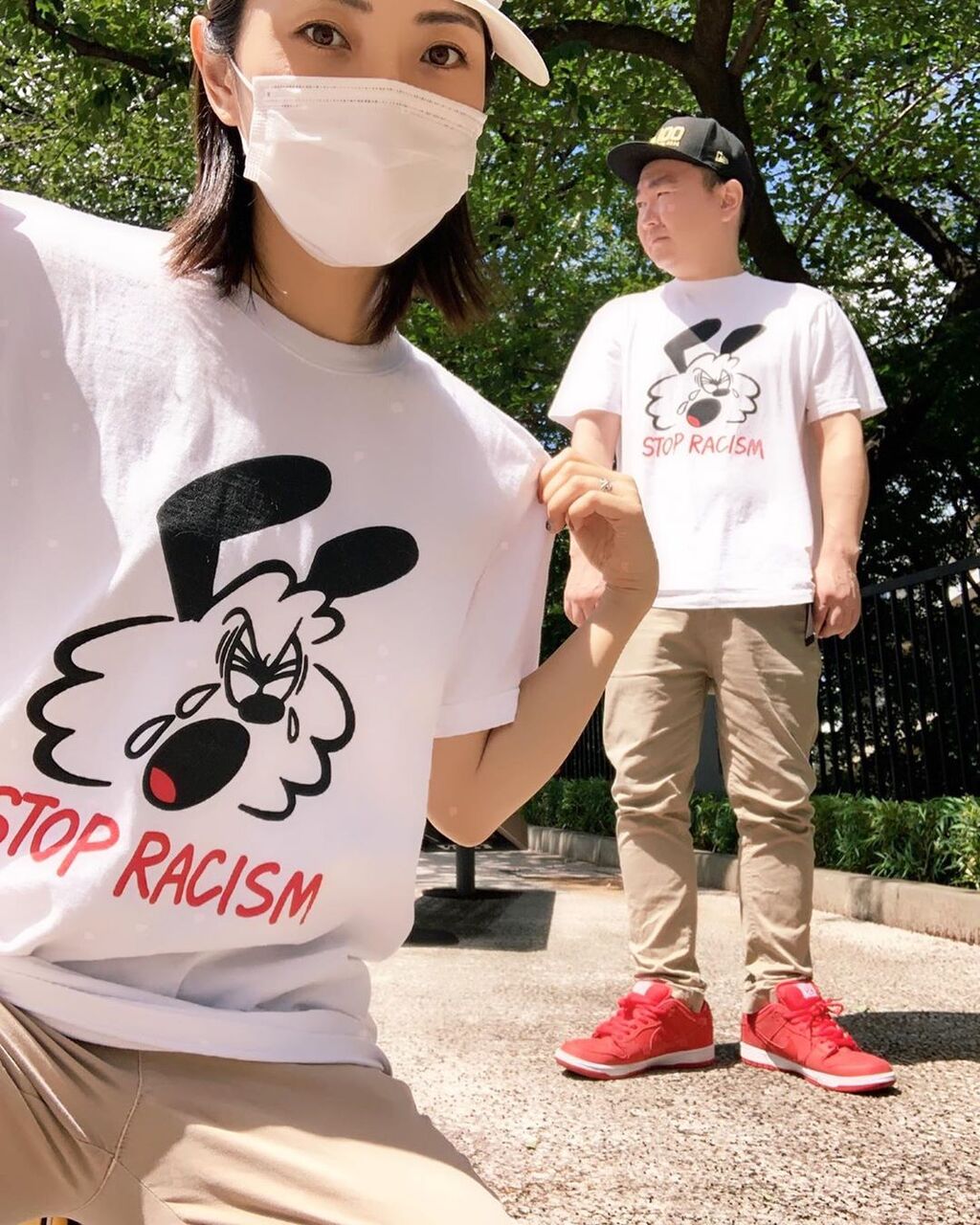 「girls don’t cryのチャリティTシャツ 黒も2枚買った サイズはMとL買って両方着た結果ぼくはぽっちゃりだったのでLで そしてMを嫁へ」と、夫婦でおそろいのチャリティTシャツをまとった2ショットをアップ。それぞれベージュのチノパンとキャップを合わせ、まるでペアルックのような姿となっている。
