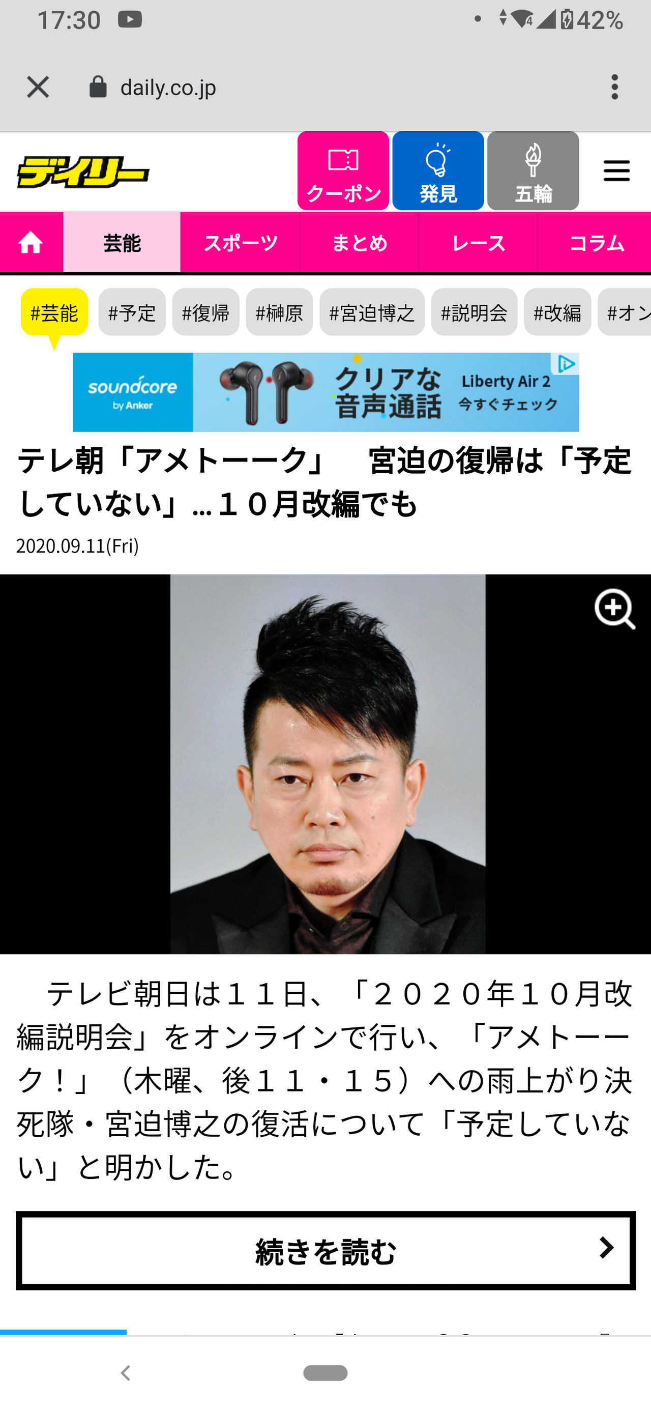 テレ朝「アメトーーク」 宮迫の復帰は「予定していない」…10月改編でも