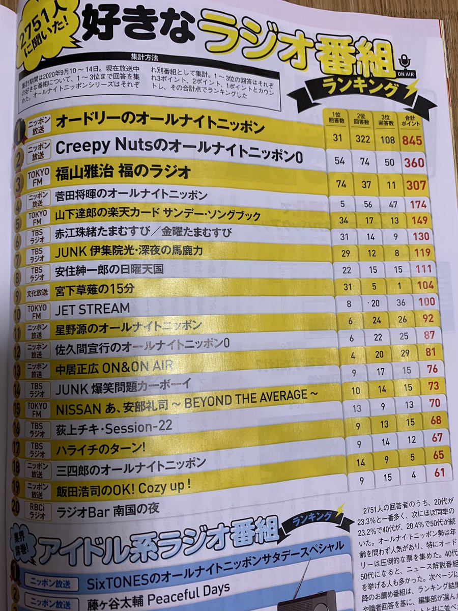 【悲報】好きなラジオ番組ランキング、1位オードリー(845点)、2位Creepy Nuts(360点)wwww