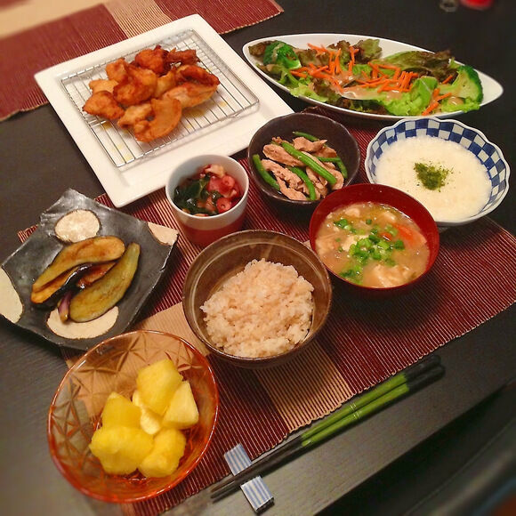 豚汁と唐揚げ一緒に食べるか?