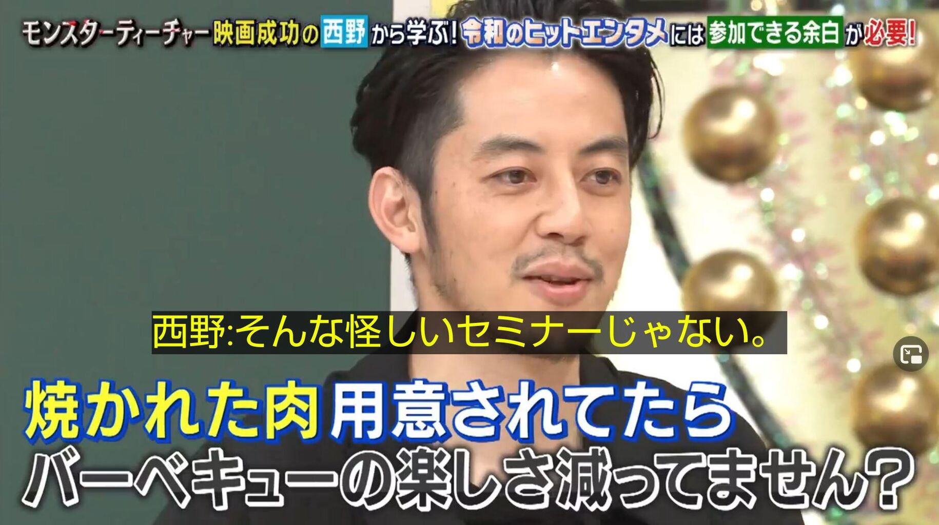 西野は前回に引き続き自身のビジネス手法を紹介するも、大悟からは「出口でお水を買って帰ったら良いんですか?」と詐欺師のレッテルを貼られてしまい、相方ノブも「金粉入ってます」と便乗。この日も西野は終始ちゃかされ続けてしまった。