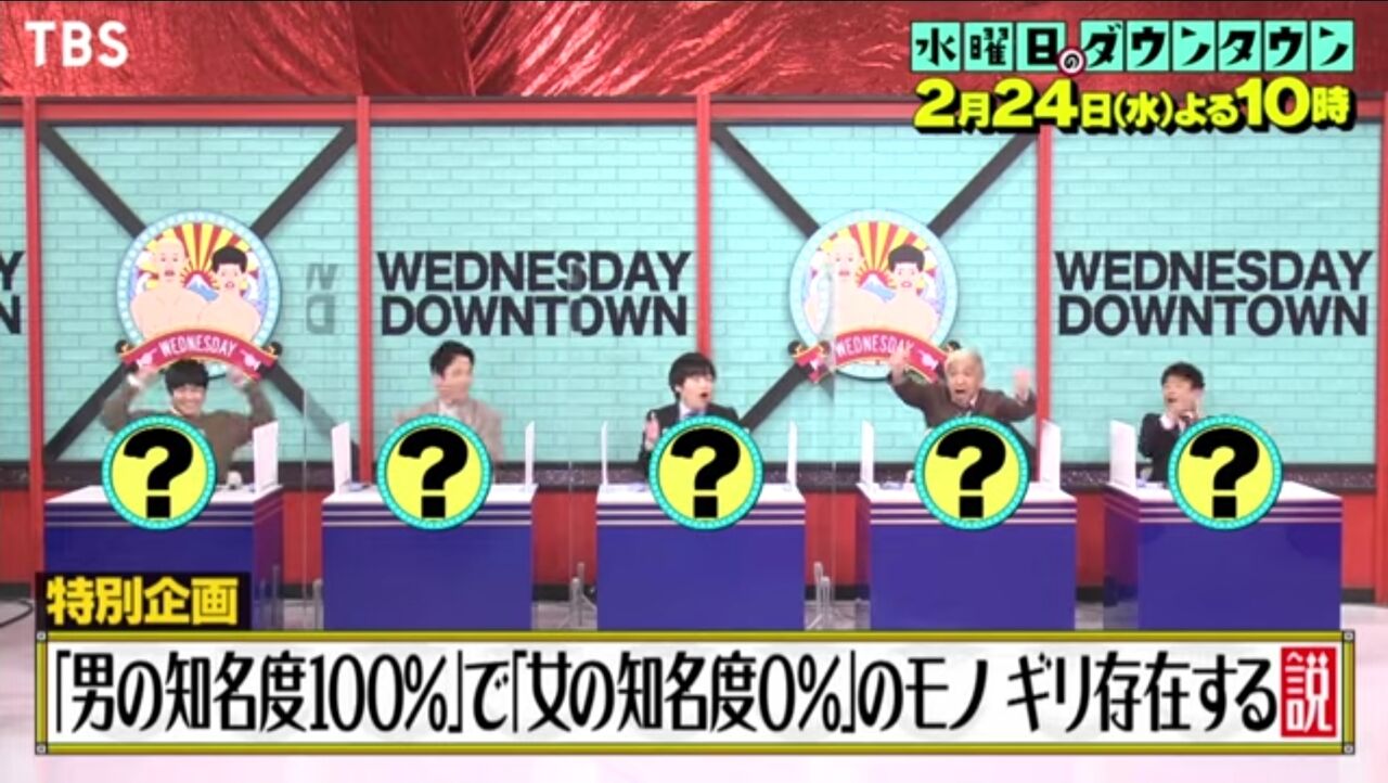 今日の水ダウ→「男の知名度100%」で「女の知名度0%」のモノ ギリ存在する説wwwww