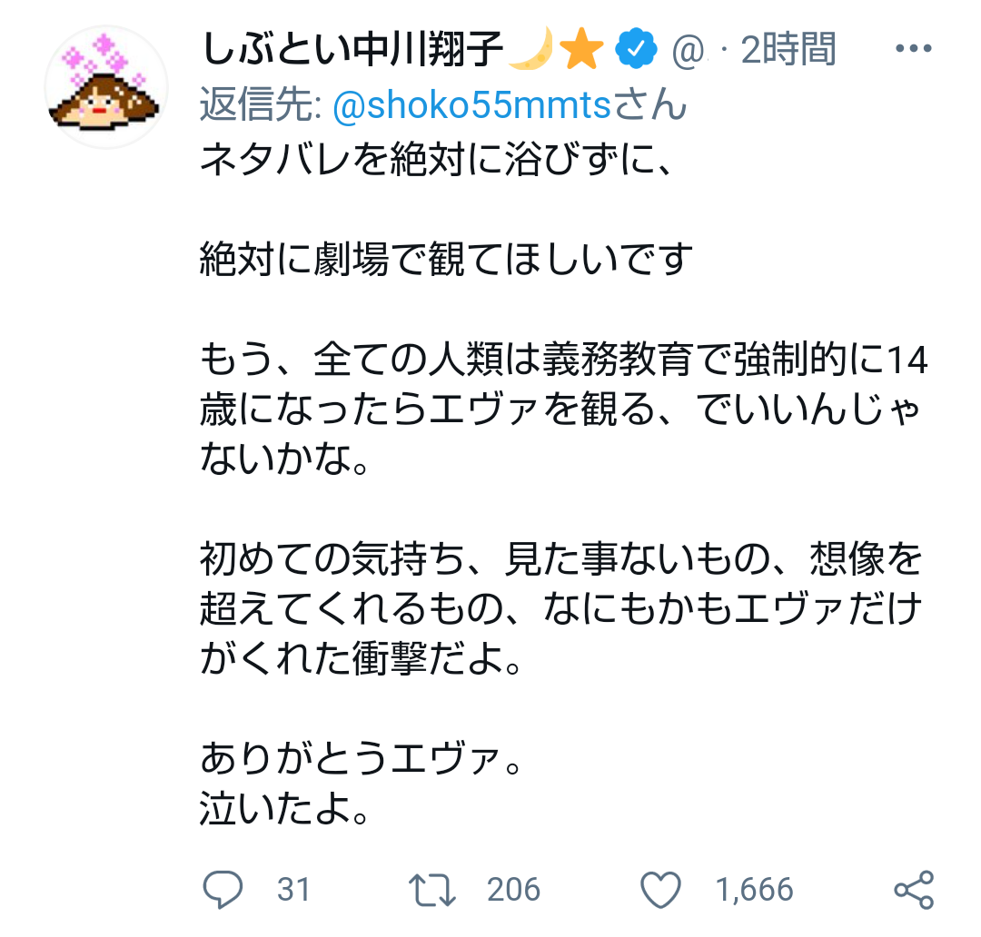 その興奮ぶりは簡単には収まらないのか、中川はさらに連続でツイートした。「ネタバレを絶対に浴びずに、絶対に劇場で観てほしいです もう、全ての人類は義務教育で強制的に14歳になったらエヴァを観る、でいいんじゃないかな」と、まさかの提案。「初めての気持ち、見た事ないもの、想像を超えてくれるもの、なにもかもエヴァだけがくれた衝撃だよ。ありがとうエヴァ。泣いたよ」ともつづった。