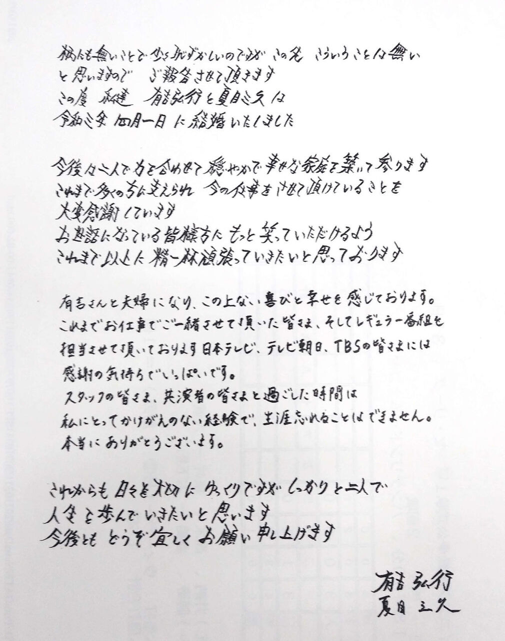 「有吉さんと夫婦になり、この上ない喜びと幸せを感じております」ってなんか意味深な書き出しやね