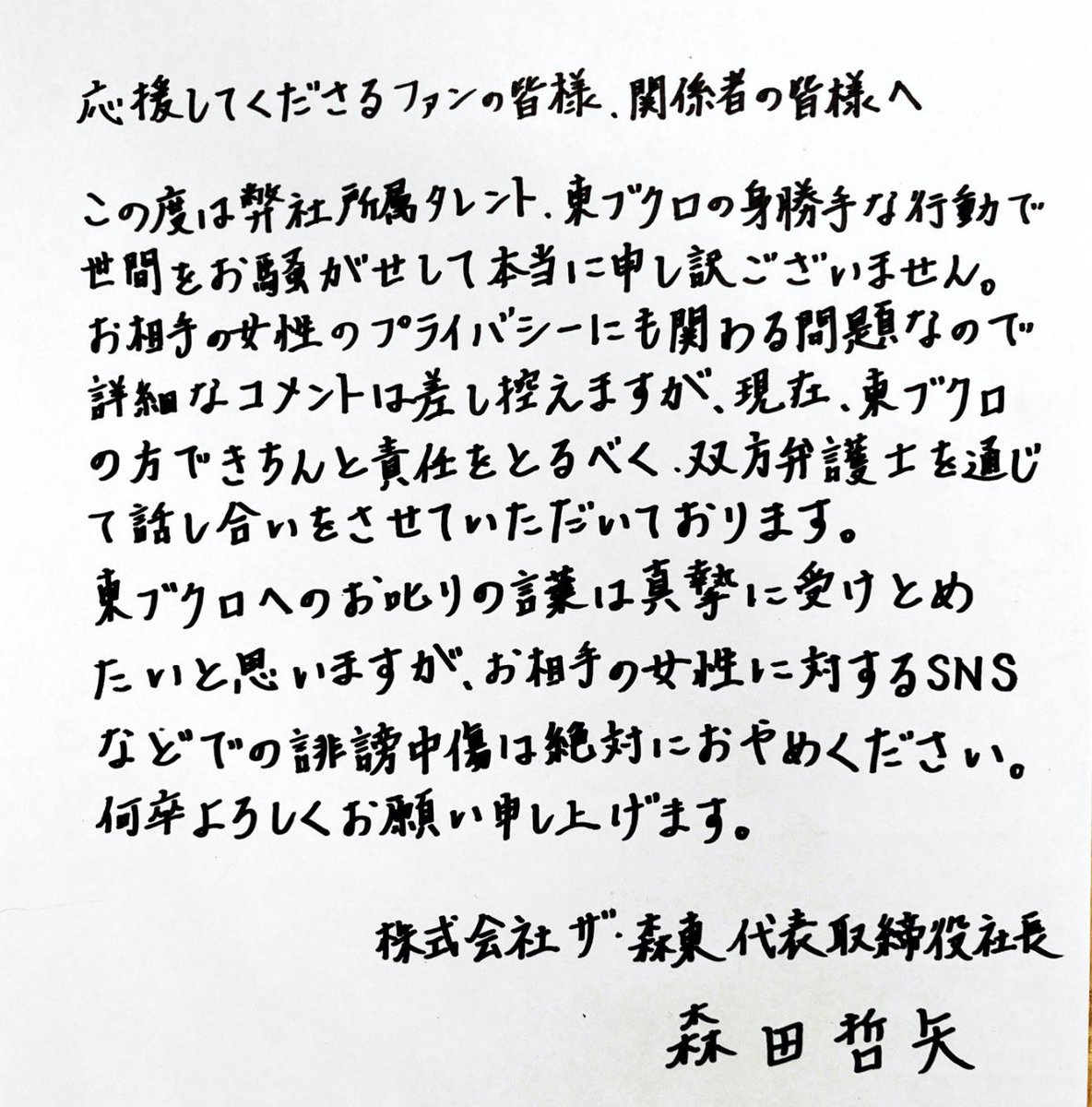 お笑いコンビ「さらば青春の光」の森田哲矢(39)が13日夜、自身のツイッターを更新。12日に「デイリー新潮」で報じられた相方・東ブクロ(35)の女性トラブルについて、直筆の書面をアップし、所属事務所「ザ・森東」の代表取締役社長として謝罪した。