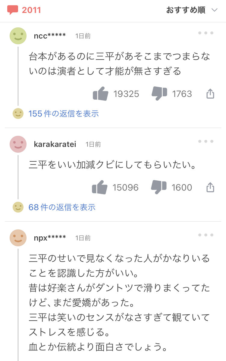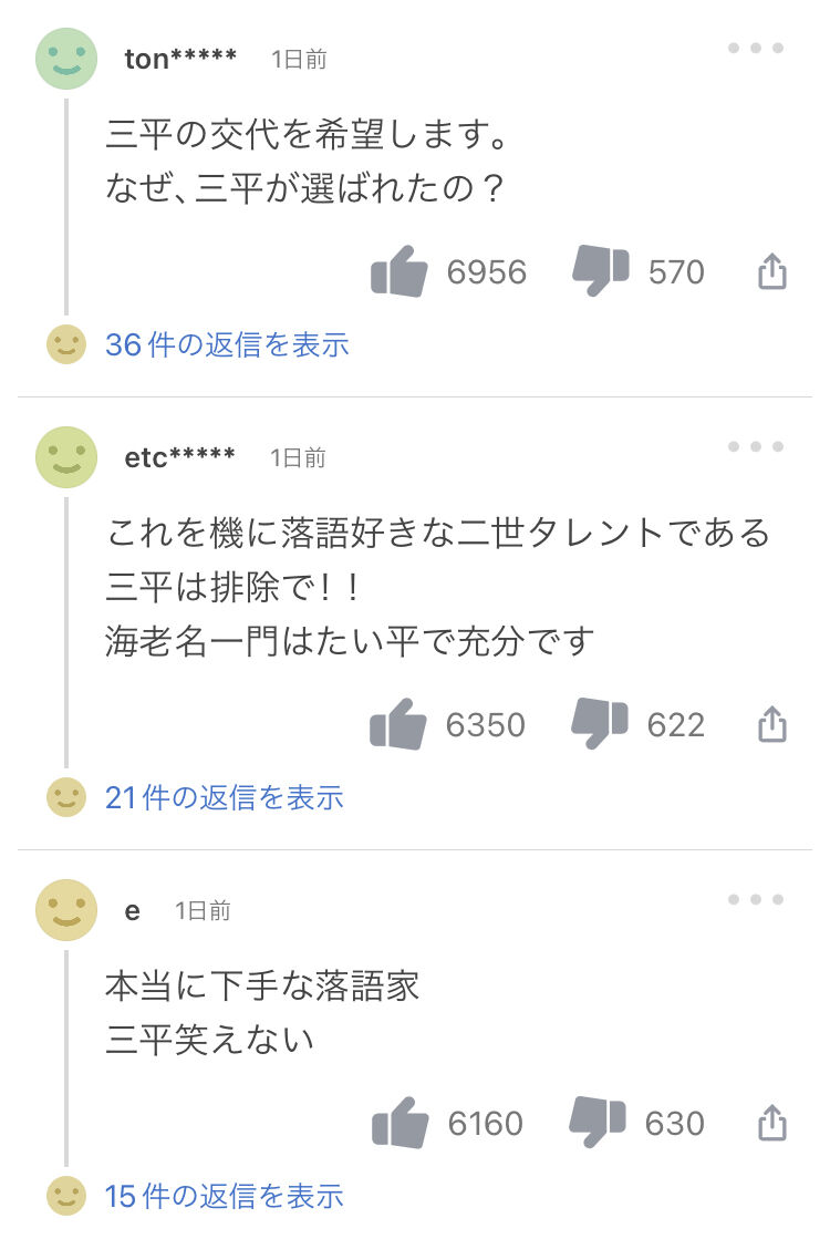【悲報】ヤフーニュース「笑点29年ぶりに席替え」ヤフコメ民「三平変えろ。三平つまらん」