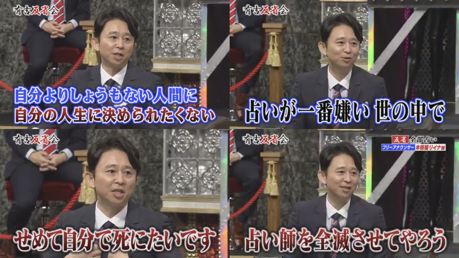 有吉弘行「(占いは)統計学っていうんだけど、統計が怪しいんだよね。どんな連中が統計取ってるのかって。国でさえ統計隠すのにさ。占いやってるようなインチキ連中の統計なんか信じられないだろ。そもそもの統計が間違ってるのに統計学って言われてもなっていう…まぁ、置いといて」