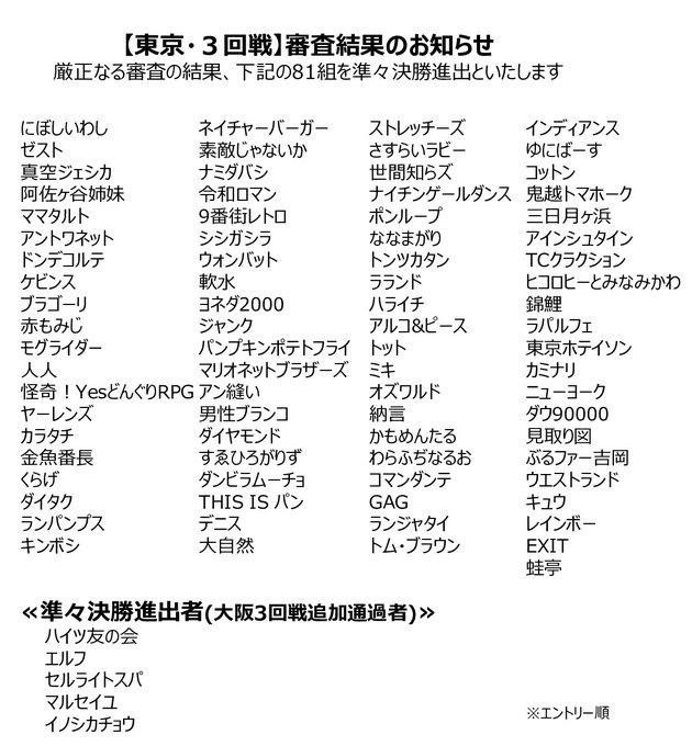 ぼる塾、四千頭身、シャウトII(池崎BKB)、カカロニ、土佐兄弟、アイロンヘッド、ダニエルズ
