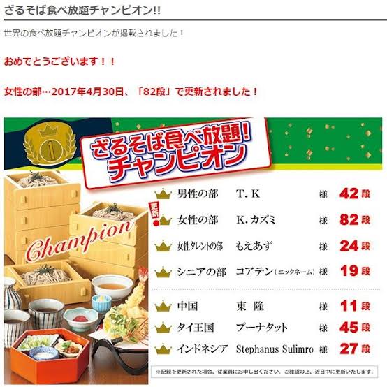 特にそば82段は、大食いアイドルのもえあずが24段だったことから3倍以上食べたことになる。そのため番組では、大食いファイターのアンジェラ佐藤、菅原初代、ジャイアント白田が同じ店舗で大食いに挑戦。店によると1段は160グラムだという。