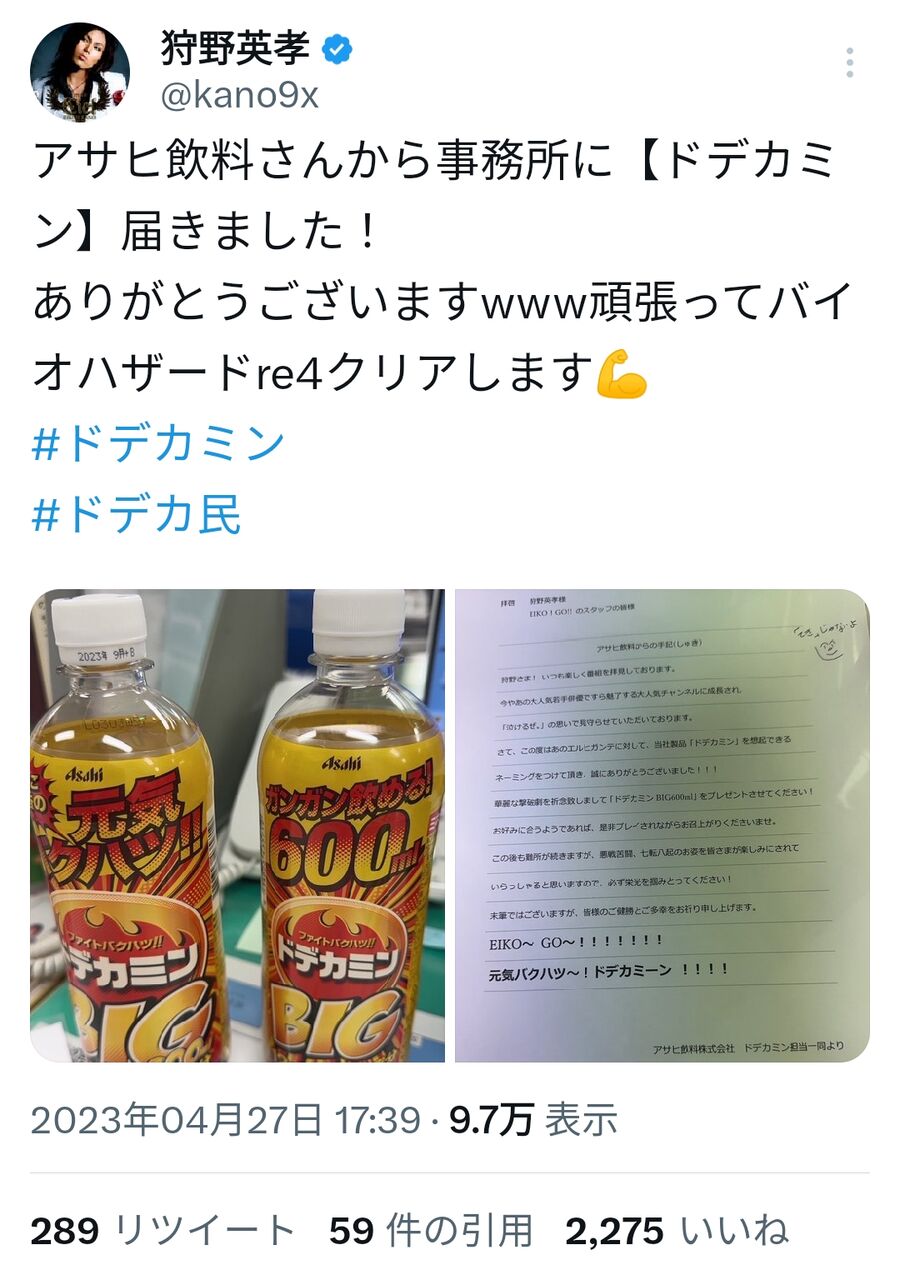 バイオハザードRE4でエルヒガンテという巨大なボスに「ドデカ民」というあだ名をつけたところ後日アサヒ飲料からドデカミンが送られてきた模様