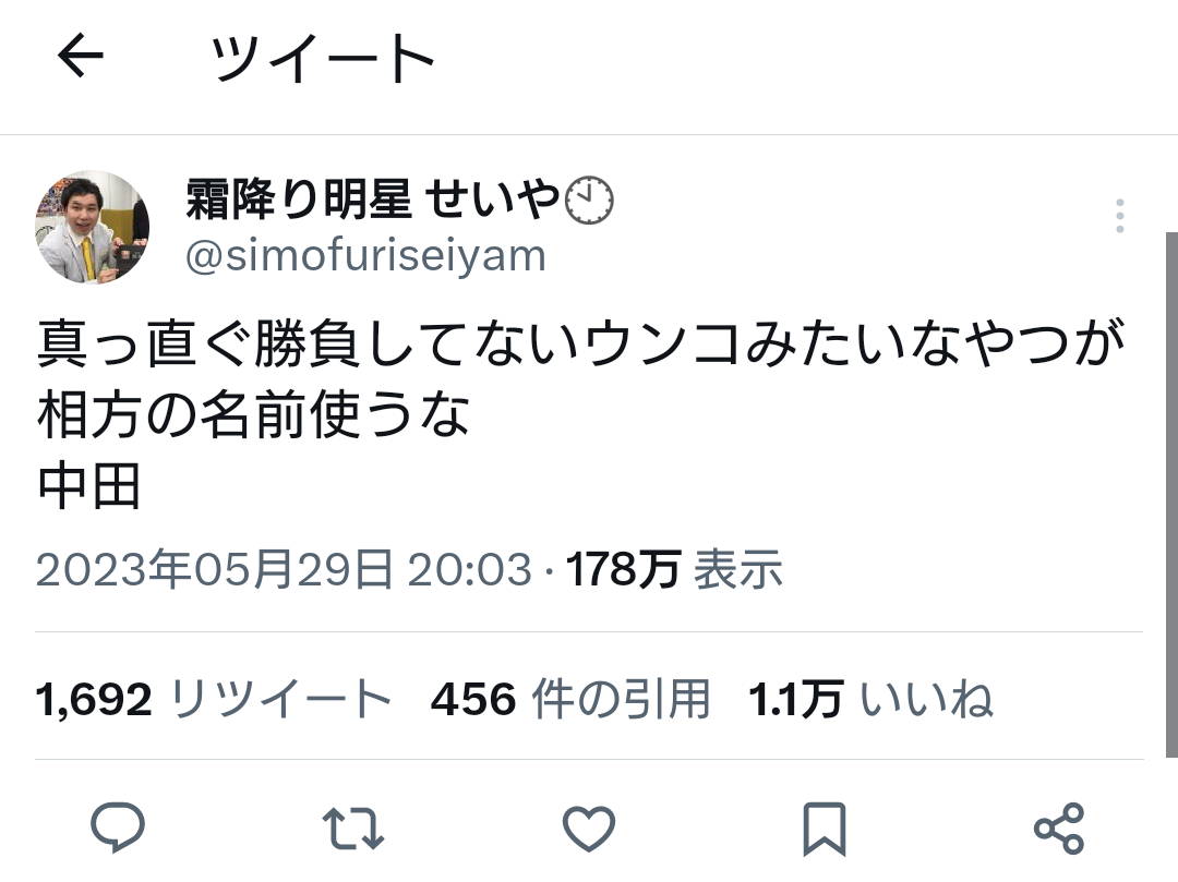 霜降りせいや「真っ直ぐ勝負してないウ〇コみたいなやつが相方の名前使うな 中田」