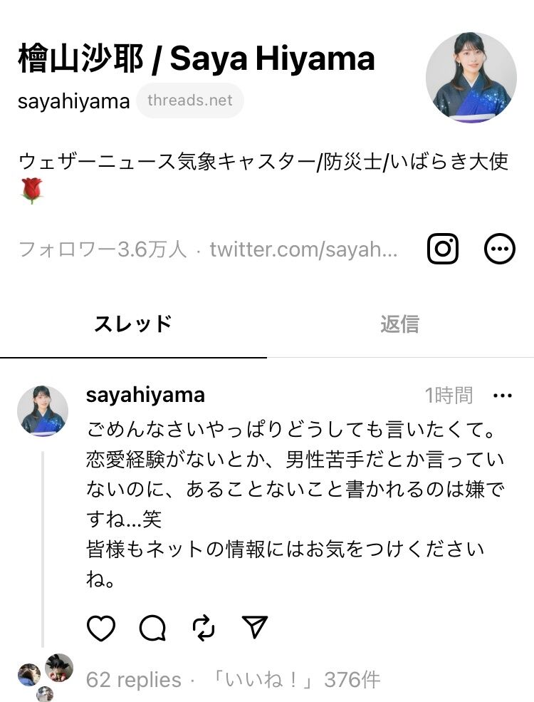 【悲報】檜山沙耶さん「恋愛経験ないとか、男性が苦手とか言ってないのに…」→削除