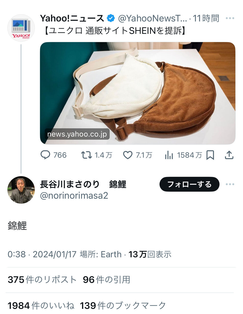 【悲報】錦鯉長谷川さん、エゴサしようとして誤爆?
