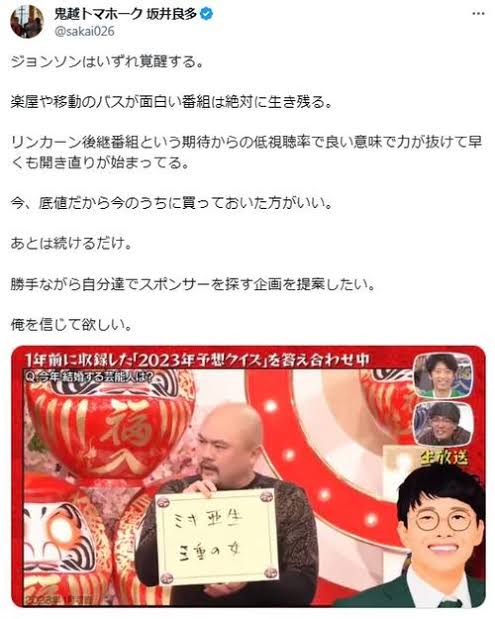 大物芸人「『ジョンソン(TBS)』はいずれ覚醒する。底値のうちにスポンサーは買うべき」