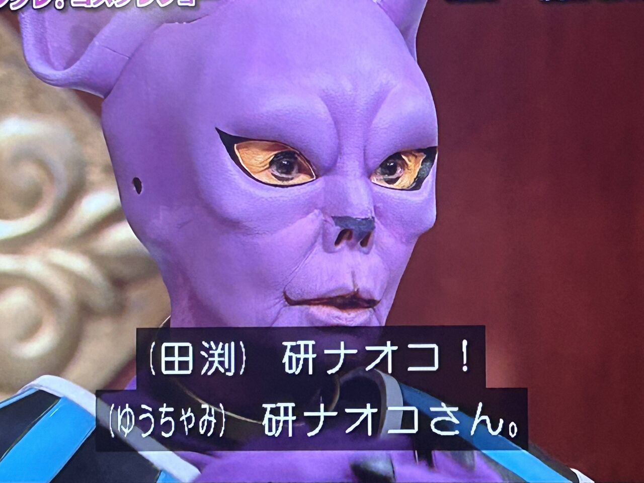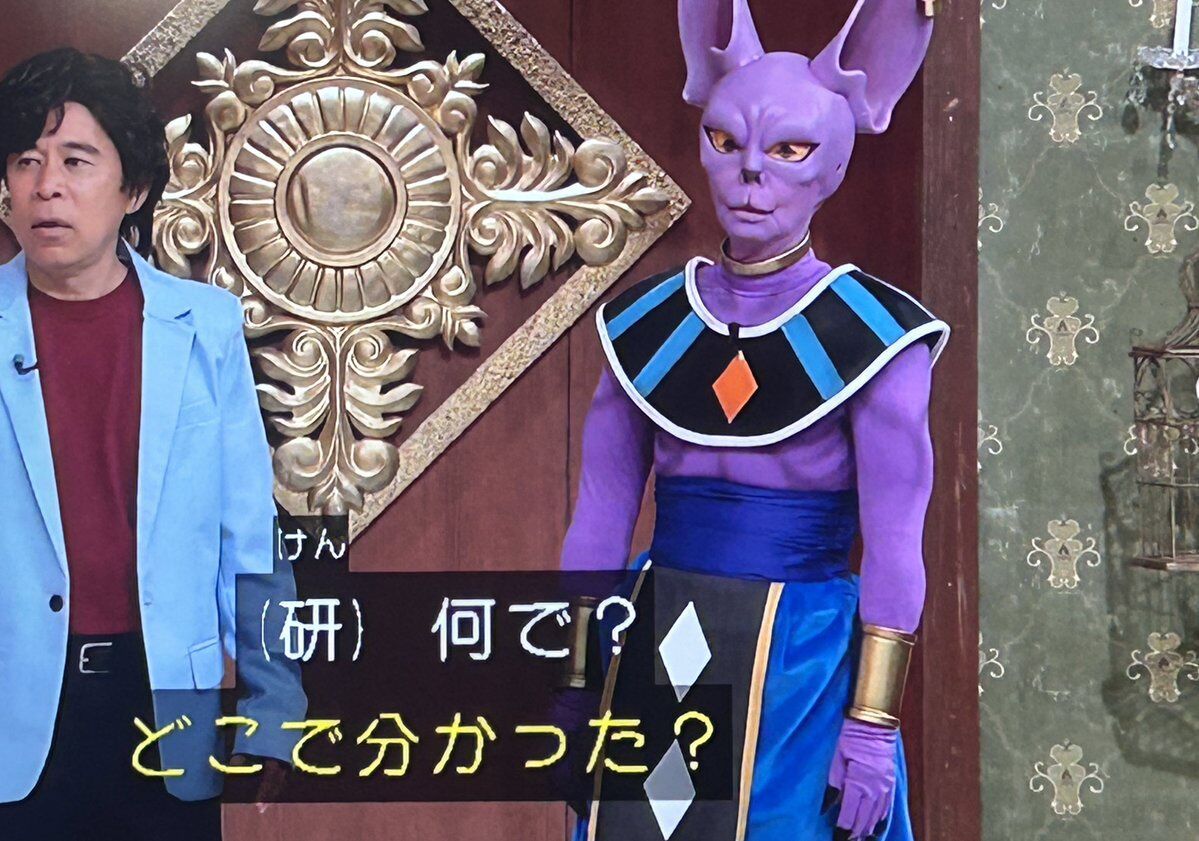 研さんは、人気アニメ「ドラゴンボール超」などに登場する破壊神ビルスのコスプレを披露。「なぜかすぐにバレる」とつづり、番組のオフショットを投稿した。