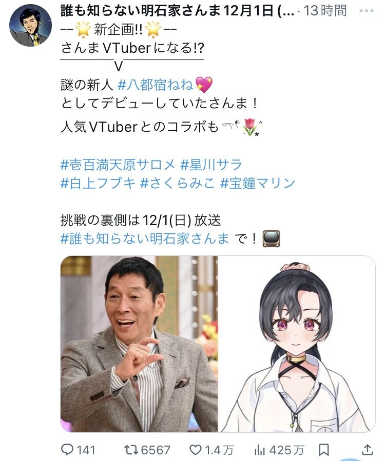 【画像】vtuber、ついに明石家さんまのバラエティ番組に出演wwwwwww