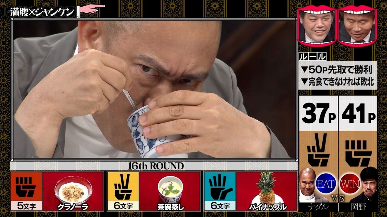 いわゆる「ジャンケン・グリコ」をベースにした大食い心理バトルの第2試合!負けたら自分が出したカードの食べ物を完食!相手を満腹でギブアップさせるか、勝ったカードの文字数を積み重ねて決められたポイントに達するか…で勝敗が決まる!