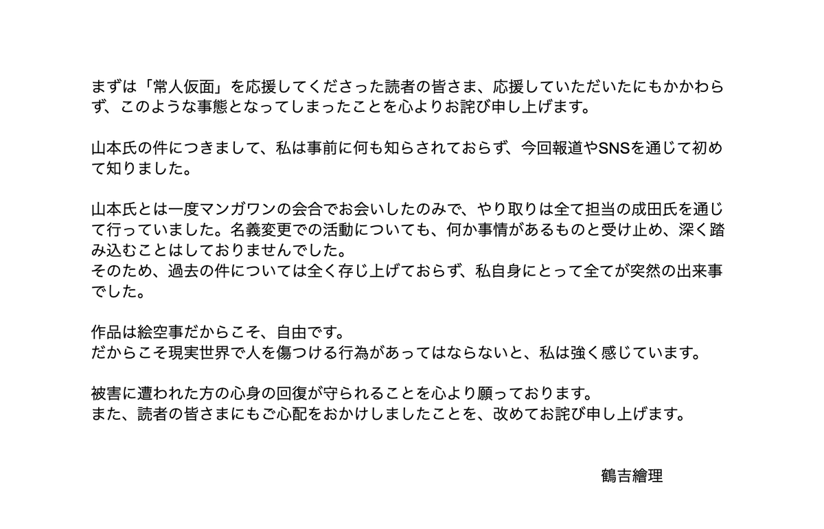 公式声明で、『常人仮面』の原作者が2020年に逮捕され、略式起訴されていたことに言及。「本来であれば原作者として起用すべきではありませんでした」として、被害者や読者、関係者に謝罪した。